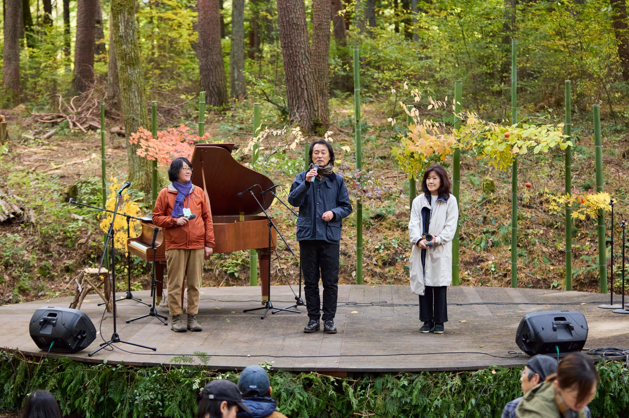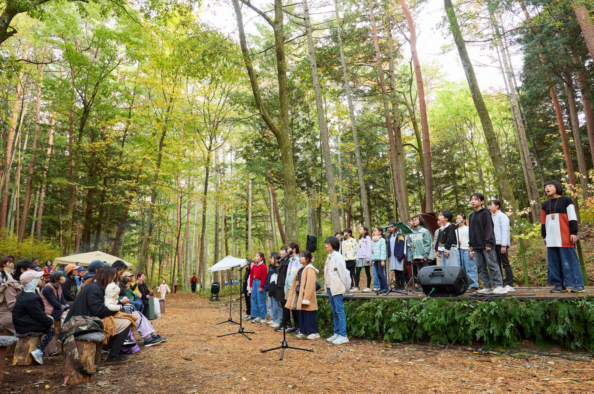 少し肌寒い花曇りの日でしたが、まっすぐな歌声が響いた瞬間、場の空気は自然と明るくやわらいでいきました。深みのある演奏から、はつらつとした歌声へ。その変化は、ひとつの色から次の色へ、そっと移っていくようでした。 観客も森も、その流れに魅了されていきます。