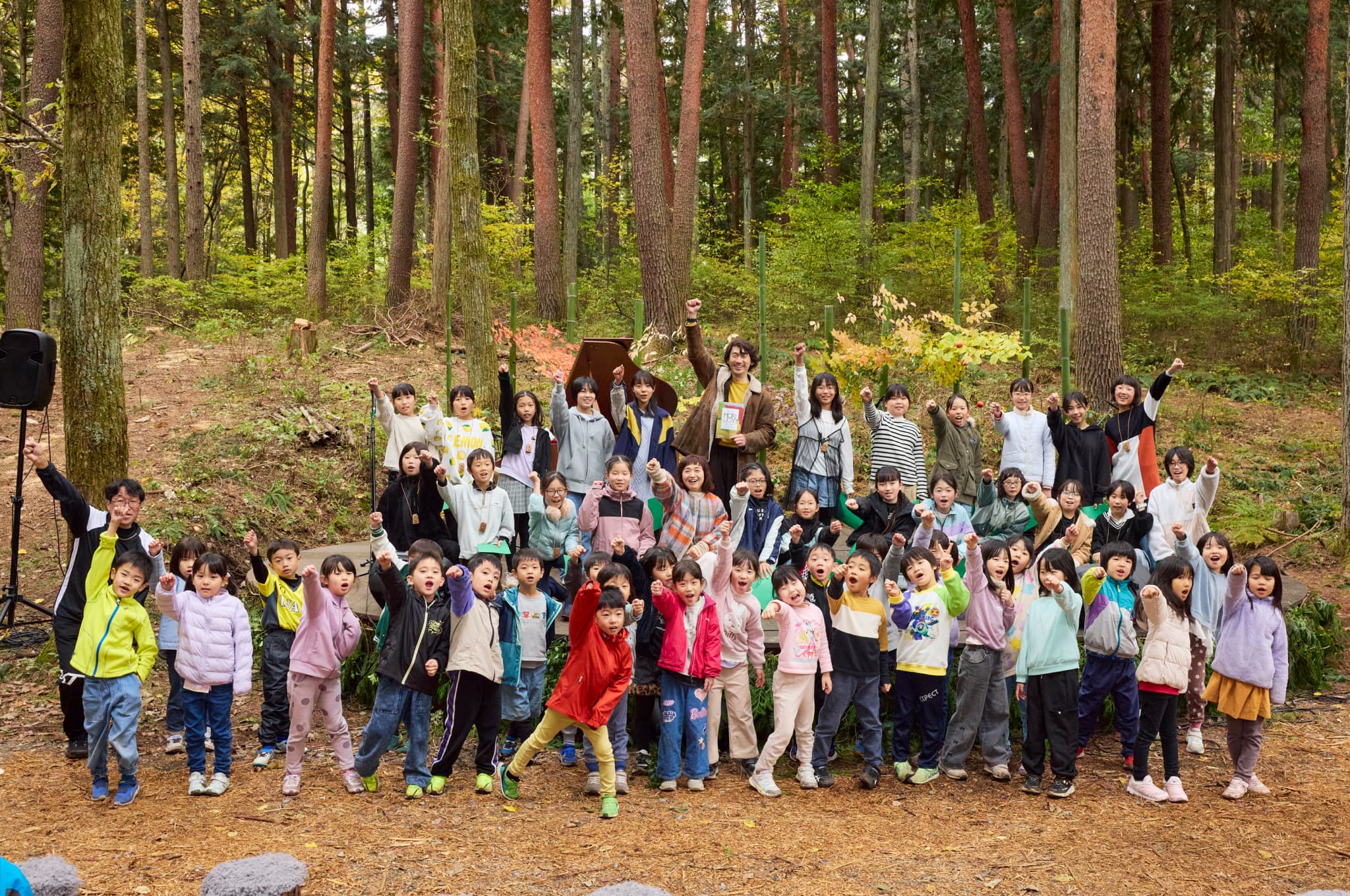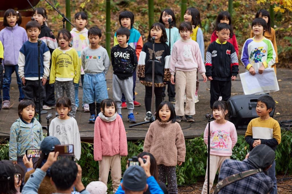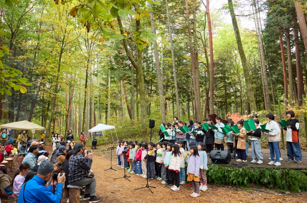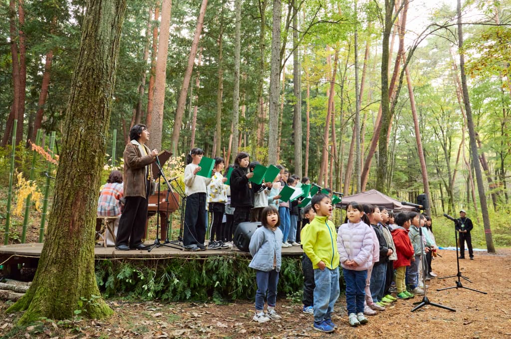 森との一体感を表現した楽曲「森のこえ(作詞:柘植伊佐夫、作曲:天山)」を全員で歌い上げる。