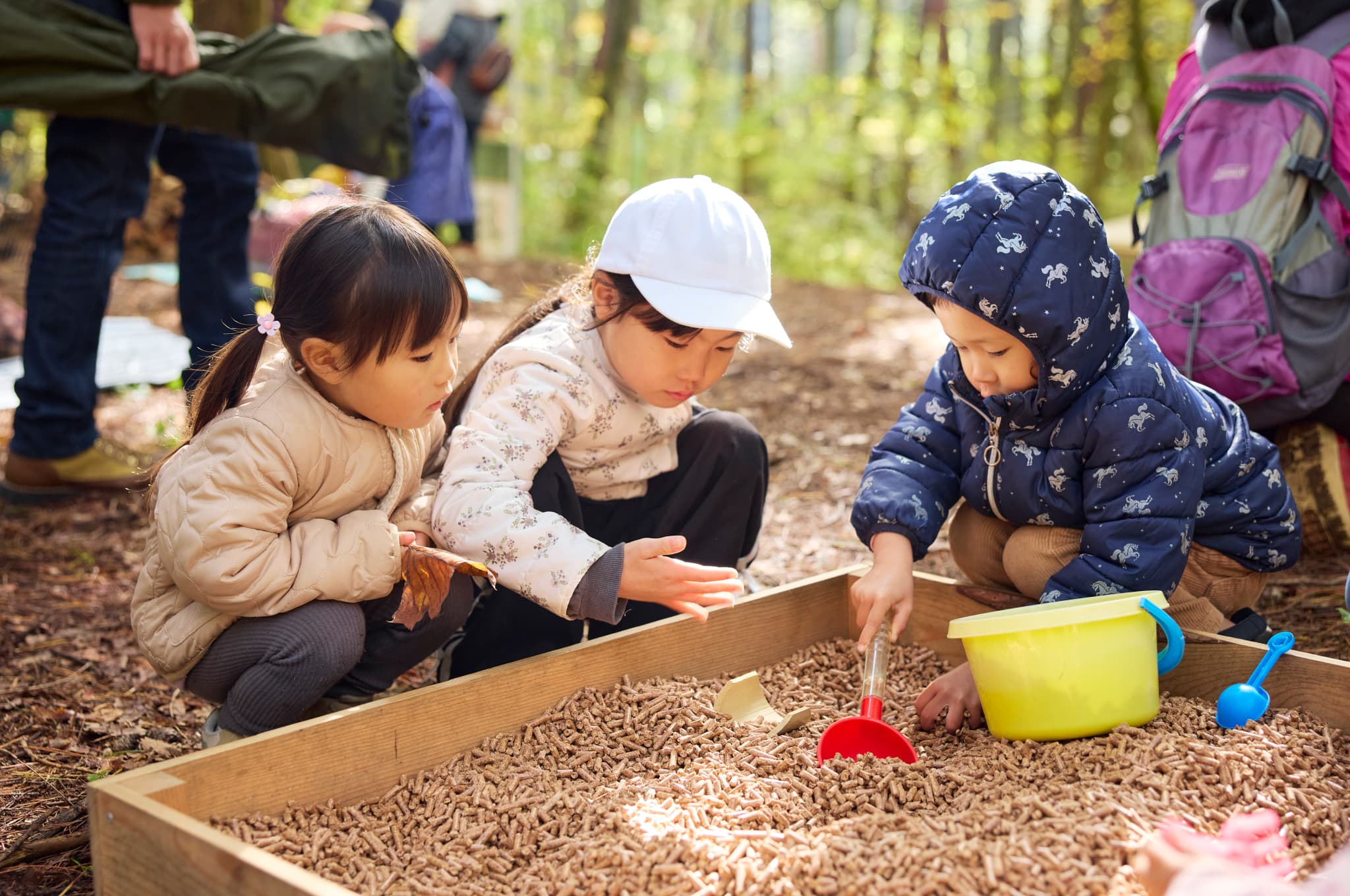 ペレット砂場では「宝探ししよ~!」「これ実は木なんだよ!」という子どもたちの歓声が。家庭用ストーブやボイラーの燃料に使われる木製ペレットが、子どもたちの遊び場に早変わり。
