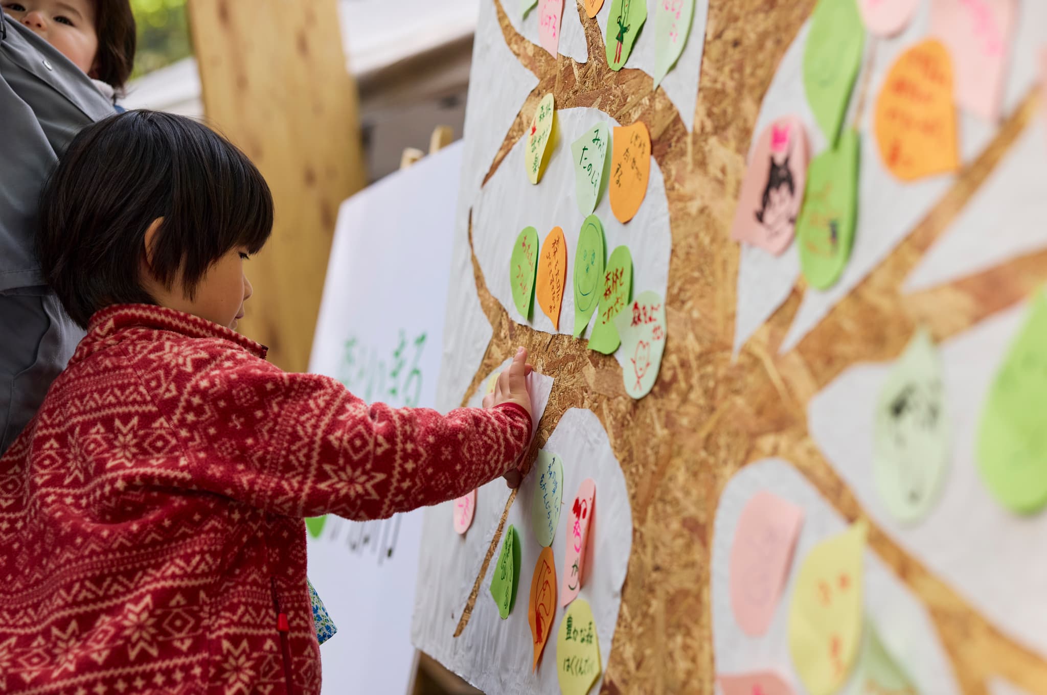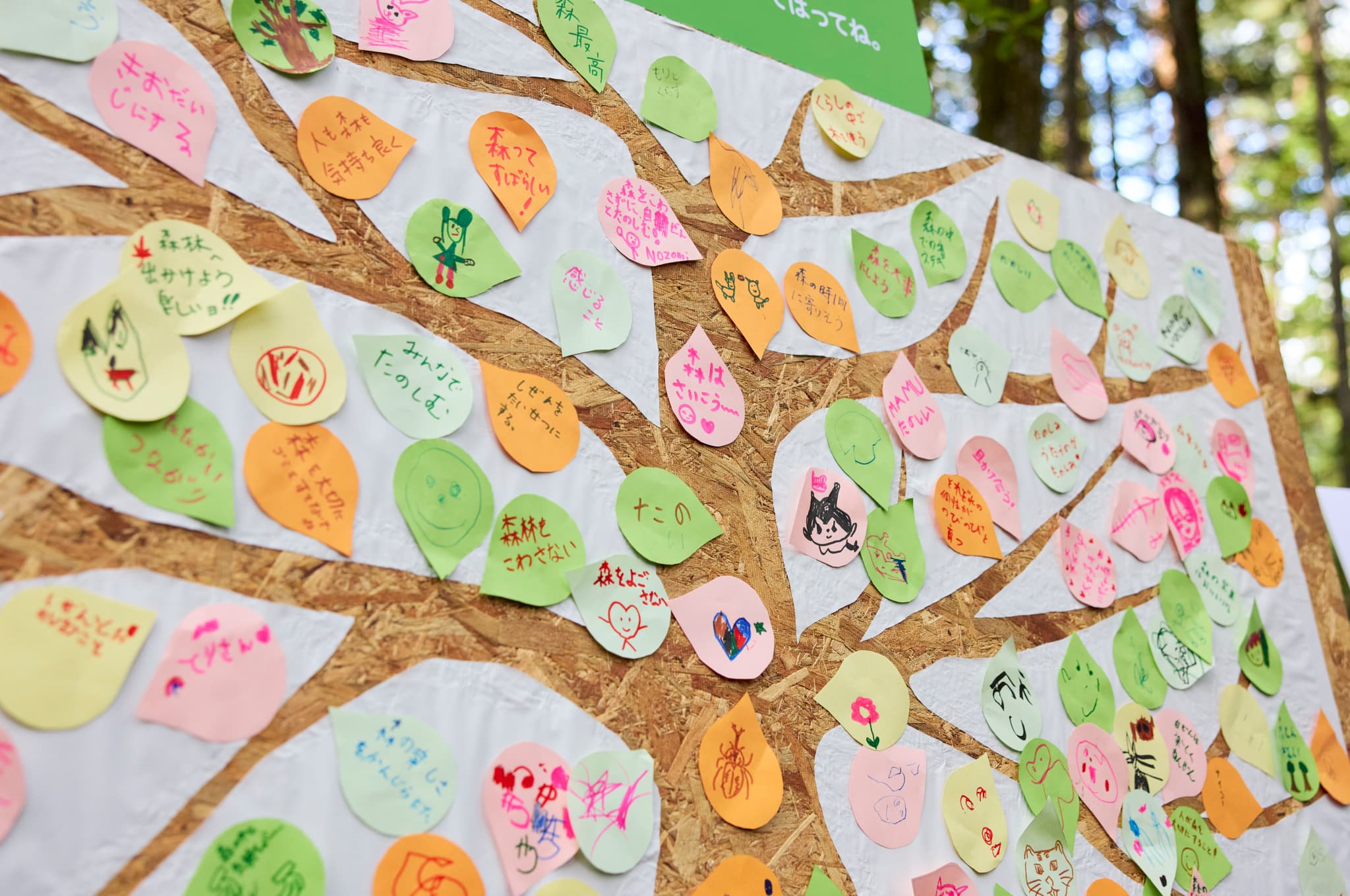 会場入り口に掲示されたパネル、みんなの「森といきる」ツリーに手書きのメッセージを貼る子ども。未来の森への自由な想いがこのツリーを彩っていく。