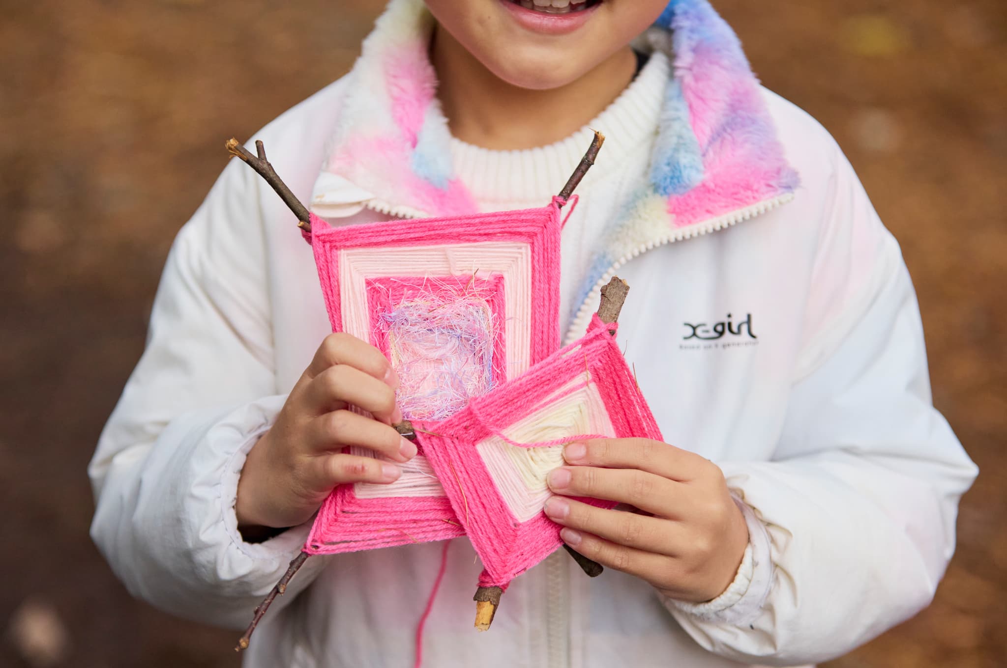 毛糸と小枝でつくった、世界にひとつの作品。小さな手から生まれた色が、やさしく並ぶ。