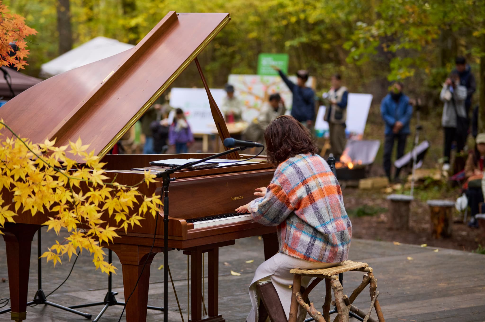 イベント早朝、会場の中に運び込まれたピアノ。木々の葉音、子どもの笑い声、風と調和しながら、ここでしか聴けない音楽会が開幕。