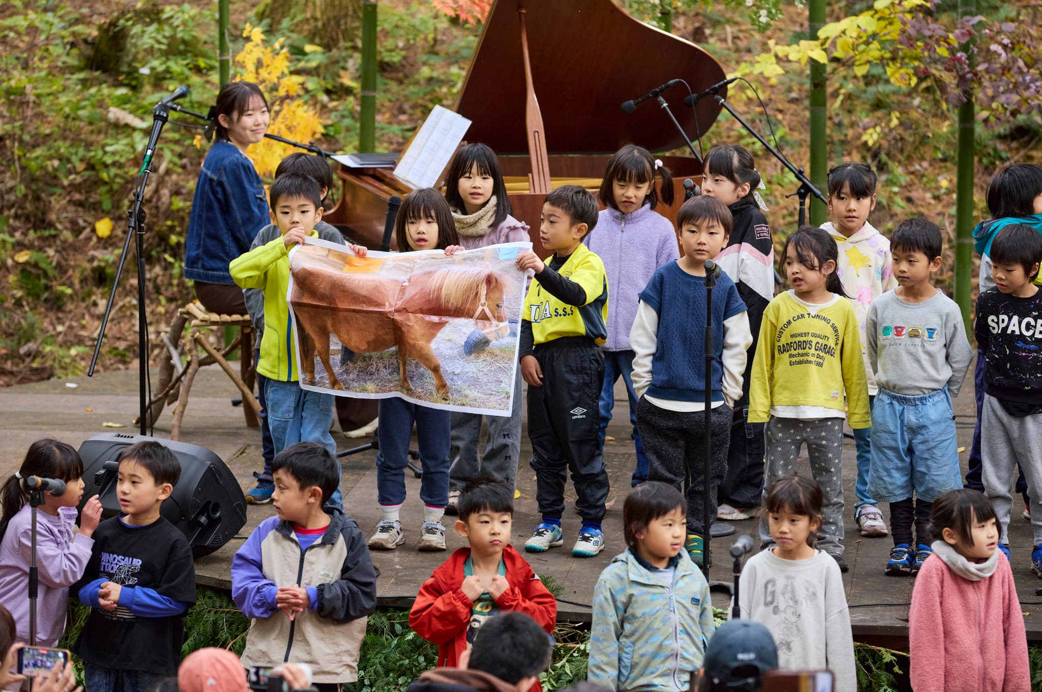 クラスで飼育する(ミニチュアホースの)ミニちゃんとお散歩している毎日を歌にしました」と語る子どもたち。可愛らしい歌声に会場はほっこり。